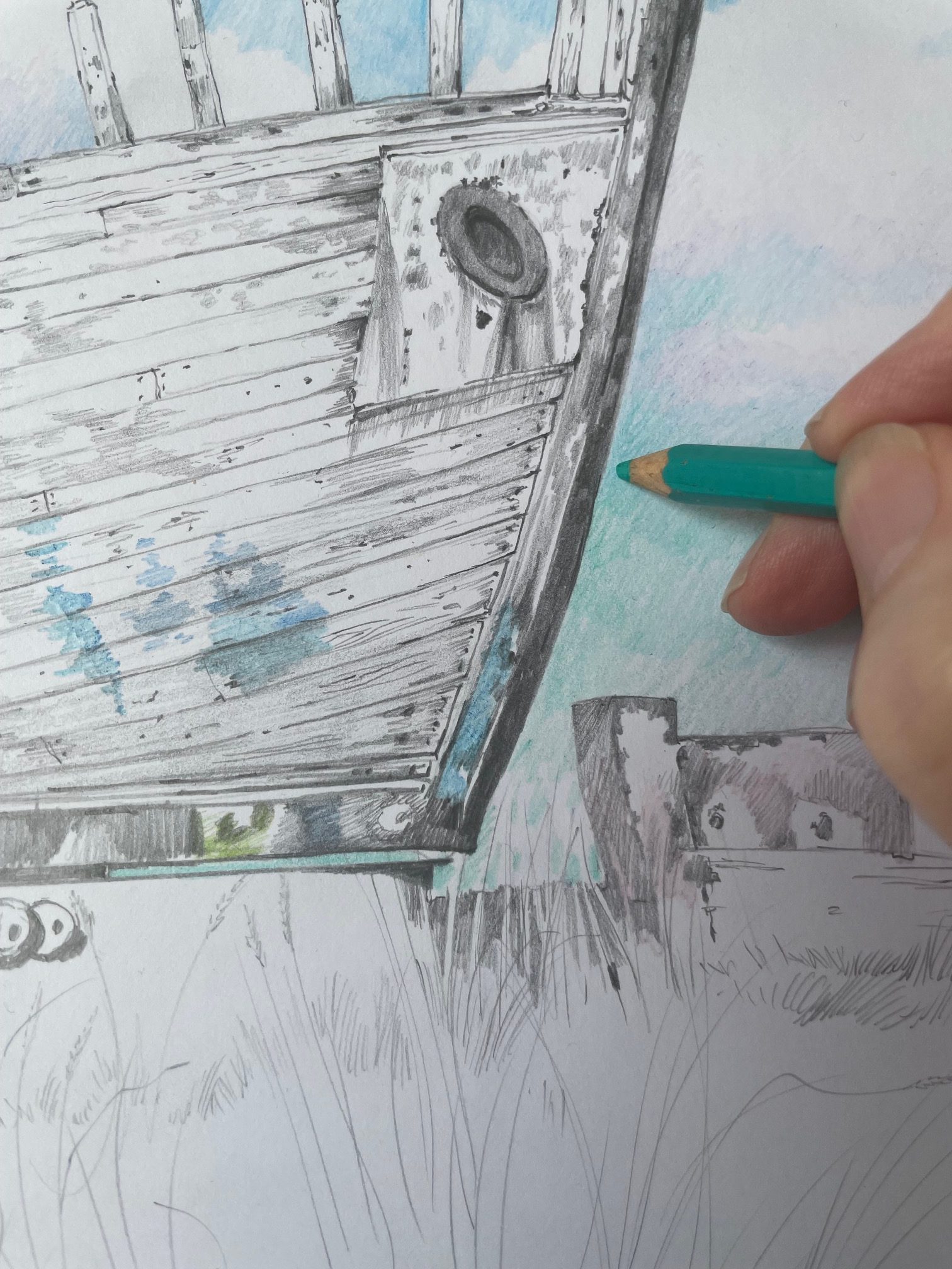 I fell in love with Iceland on my first visit in 2018 – the buildings, landscape and colours are so different from Ireland and yet there were striking visual similarities between the old fishing trawlers in both countries. This sketch is of the ‘Dolphin’ a ruined trawler near Akranes lighthouse. I had an exhibition of my paintings in the lighthouse in 2022, during the Irish Days Festival, ‘Ireland to Iceland: Over Water’ a mixture of Irish and Icelandic scenes. In 2026 I will release Limited Edition Prints of my Icelandic collection.