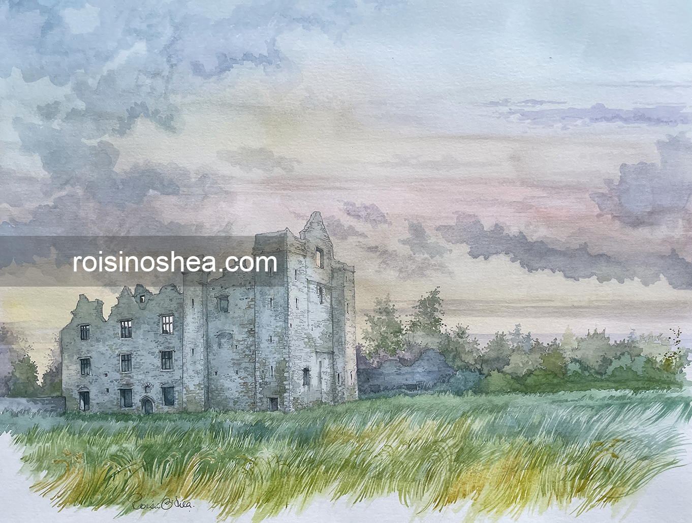 Built and modified between the 15th and 17th centuries, Athlumney is a fortified house and tower. This is an original watercolour painting by Irish artist Róisín O’Shea, direct from the artist’s studio in County Waterford, Ireland, painted in 2023.