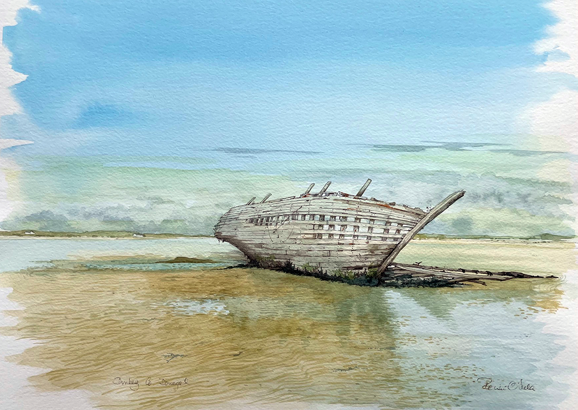 Báid Eddie (Eddie’s boat) was built in Britanny France and washed up on Magheraclogher beach in the 1970s – it is now an iconic landmark. This is an original watercolour painting by Irish artist Róisín O’Shea, direct from the artist’s studio in County Waterford, Ireland, painted in 2024.