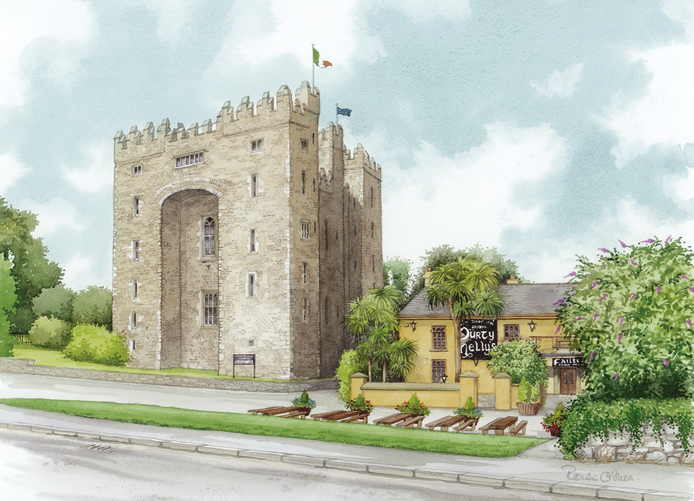 A large 15th century tower house in Bunratty village County Clare, built circa 1425 – painted by the artist in 2003.
