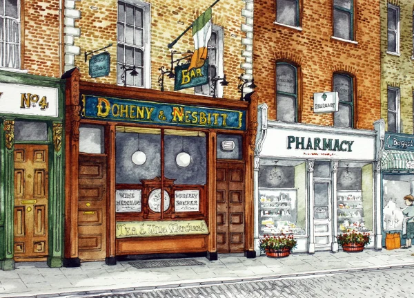 Located in Baggot street, Dublin City, this pub was established in 1867. The artist regularly met a group of friends here in the 1980s when she was studying at the National College of Art & Design which was then located on Kildare street. Painted by the artist in 1993 and released initially as part of a Pimpernel table mat collection through LL Bean in the U.S.