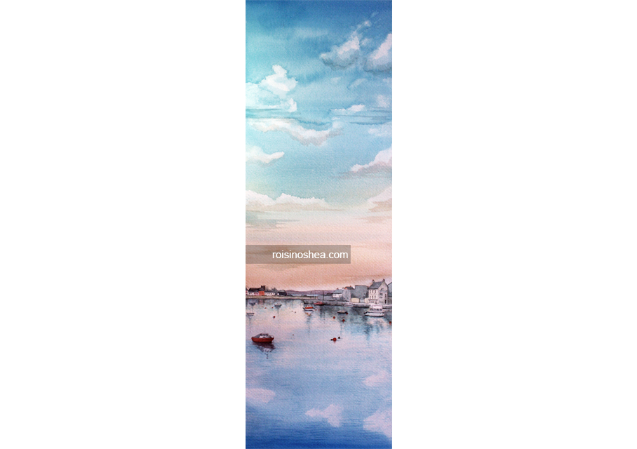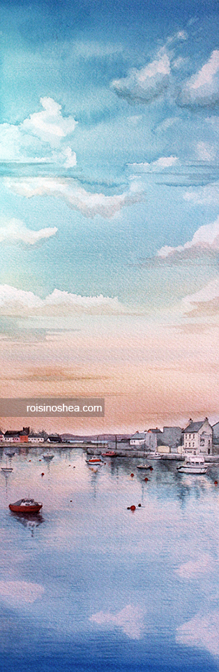 A faithfully reproduced Limited Edition print of Dungarvan Harbour as the sun sets on a still Summer evening. Painted by the artist in 2008.