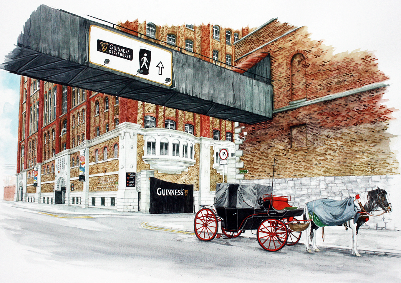 An iconic tourist attraction located at St James’ Gate, Dublin City in buildings constructed circa 1902 as a fermentation plant for the Brewery – it was the front cover of a commemorative Guiness Storehouse calendar – painted by the artist in 2017.