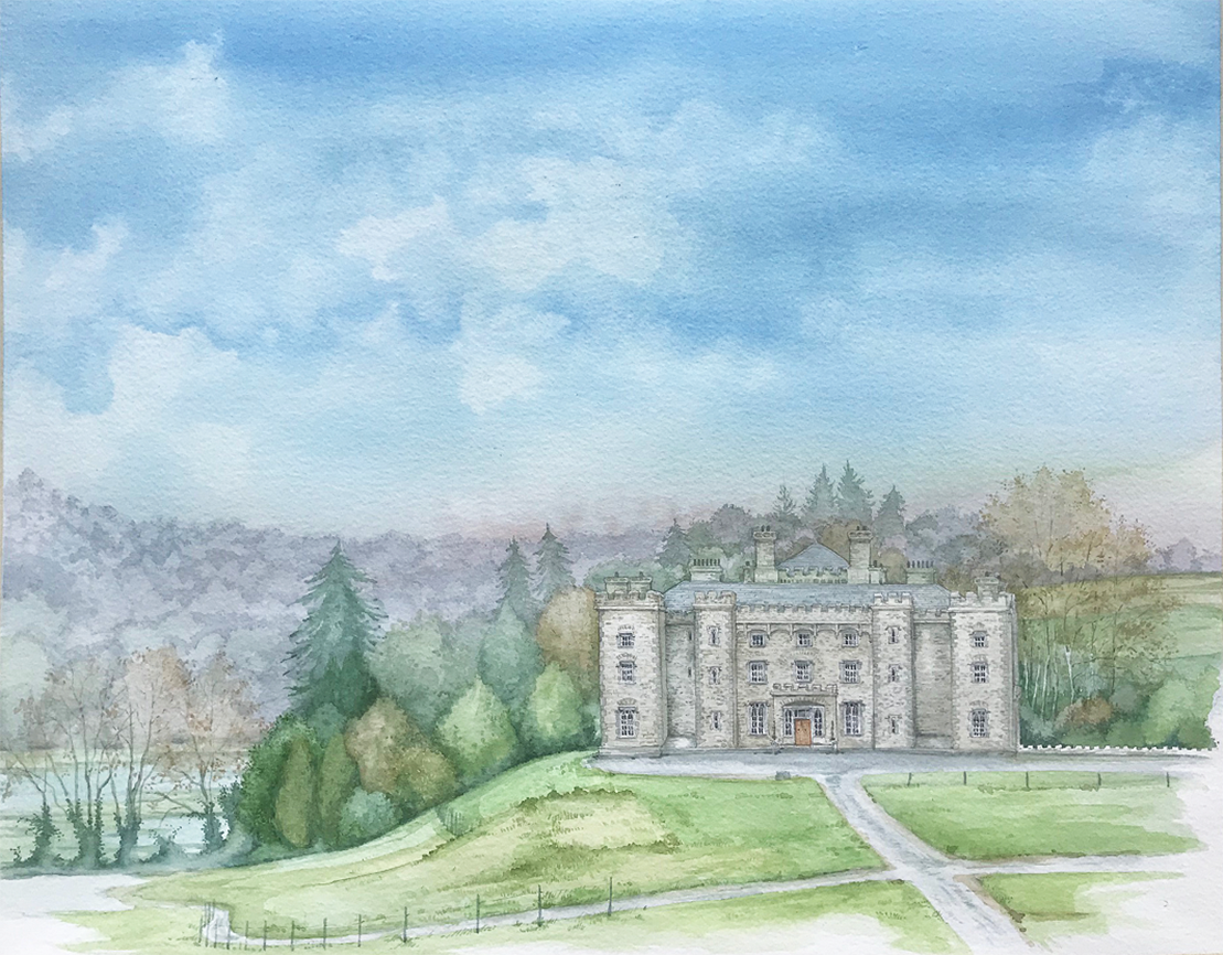 Designed by architect James Gandon and reconstructed under the direction of William Burton Conyngham and his nephew the first Marquess Conyngham in 1785, Slane Castle has played host for music events in the last quarter century and is famous for hosting open air rock concerts – painted by the artist in 2019