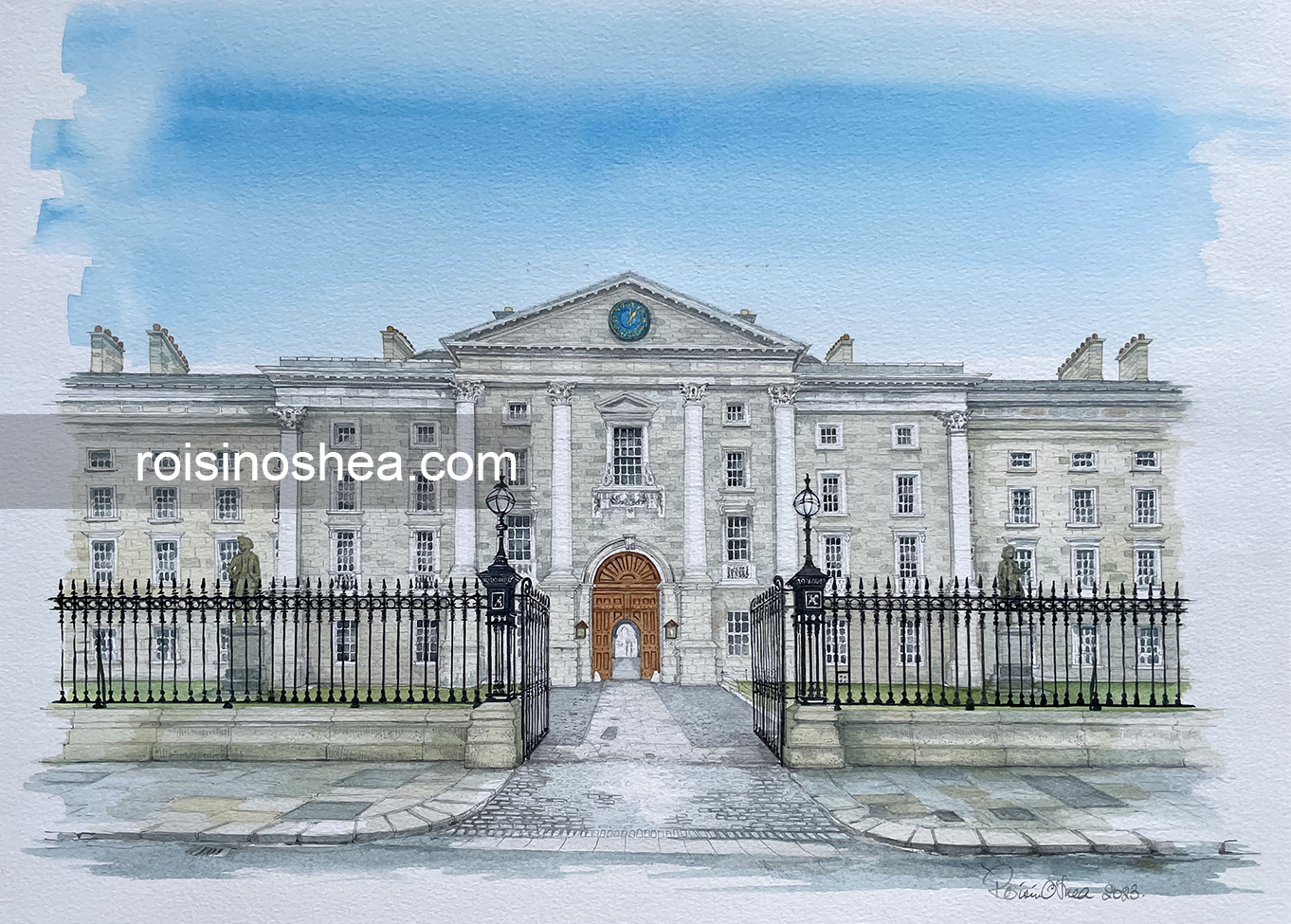 This is a view of the front gate entrance to Trinity College, which was founded in1592. This is an original watercolour painting by Irish artist Róisín O’Shea, direct from the artist’s studio in County Waterford, Ireland, painted in 2024.